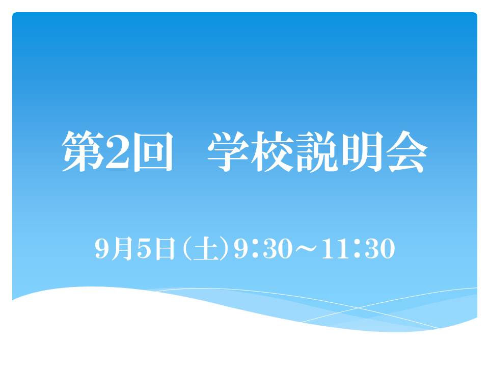 9月5日(土)に今年度の第2回学校説明会を開催いたします。当日は学校説明・入試説明のほか、本校の授業の様子をご見学できます。キッズルームも設置いたしますので、お子様連れの参加も可能です。皆様のご来校をお待ちしております。