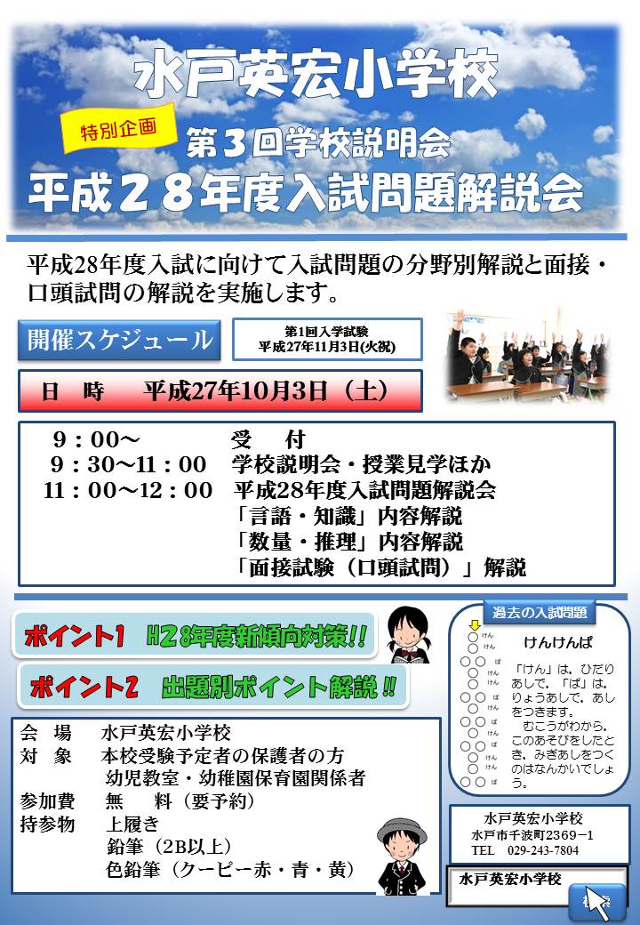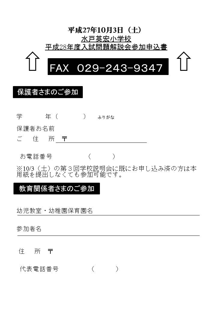 10月3日(土)に「平成28年度入試問題解説会」を開催いたします。当日は、平成28年度入試の新傾向問題の解説や出題別のポイント整理を入試担当よりご説明申し上げます。今回の解説会は保護者の皆様の他、幼児教室・幼稚園・保育園の先生方対象となります。お子様連れでの参加もOKですが、ご理解のほどお願い申し上げます。なお、第3回学校説明会に既にお申し込み済の方は当日のお申し込みでも大丈夫です。未就園児及び年少さん・年中さんの保護者の方でも参加もOKです。皆様の参加をお待ちしております。【定員に達したため受付を終了しました。たくさんのお申し込みをいただきありがとうございました。これからお申し込みの方は「個別相談」の形式で別日程での対応となります。】