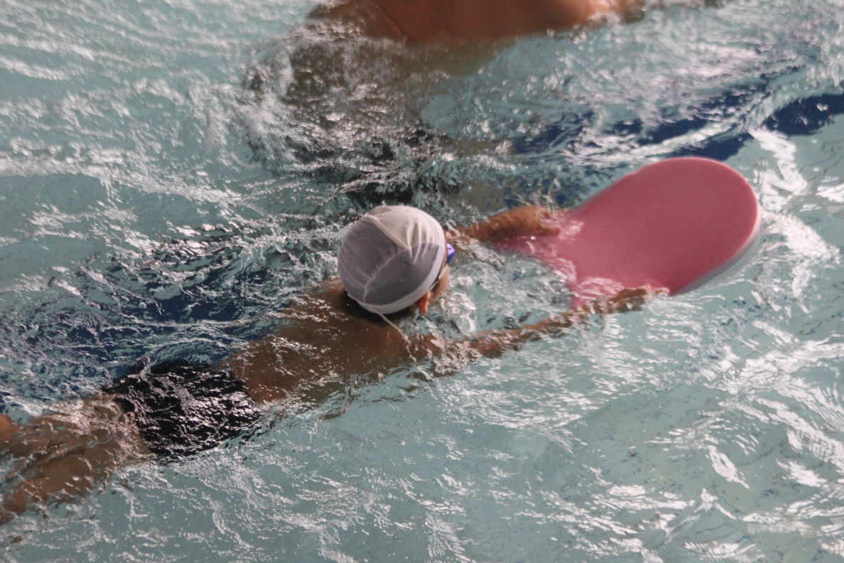 少し泳げるグループは,始めはビート板で足の練習をしっかり行い,そのあと,手を伸ばして,ビート板なして泳いでいました。