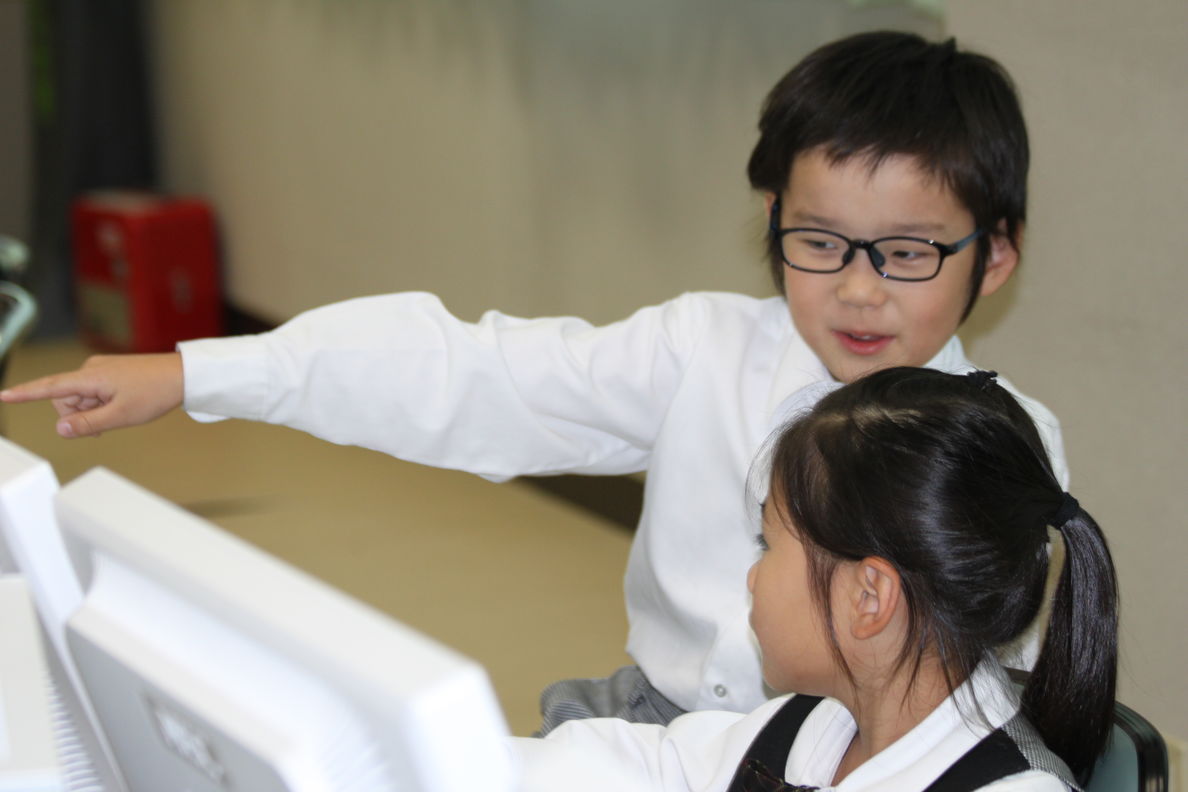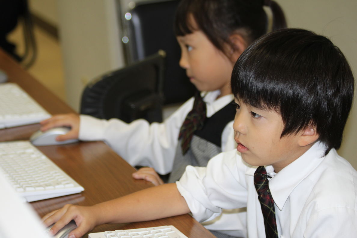 パソコン教室の1コマ。マウスで細かな絵を書いたり,立体をマウスで回転移動させたりする活動をしました。1年生のマウス操作も上達し,笑顔でパソコンに親しんでいます。