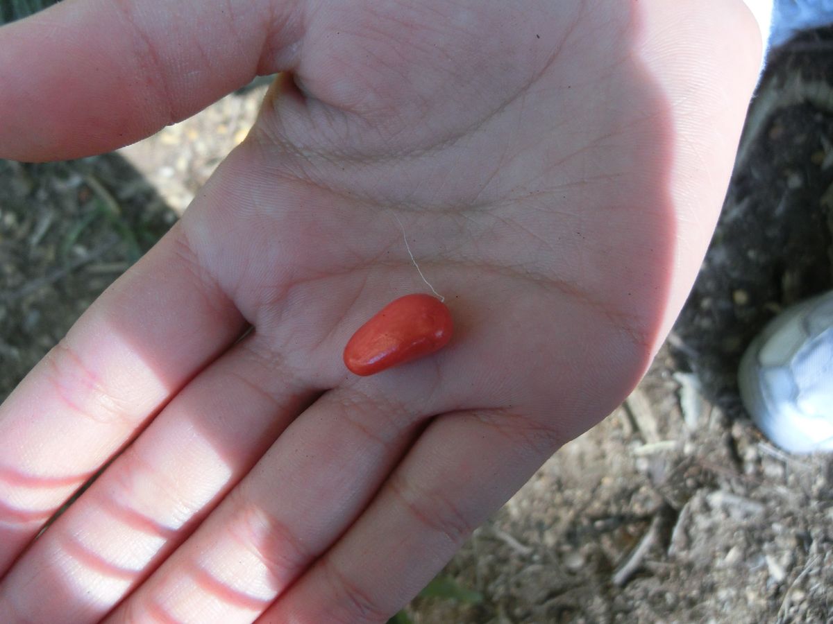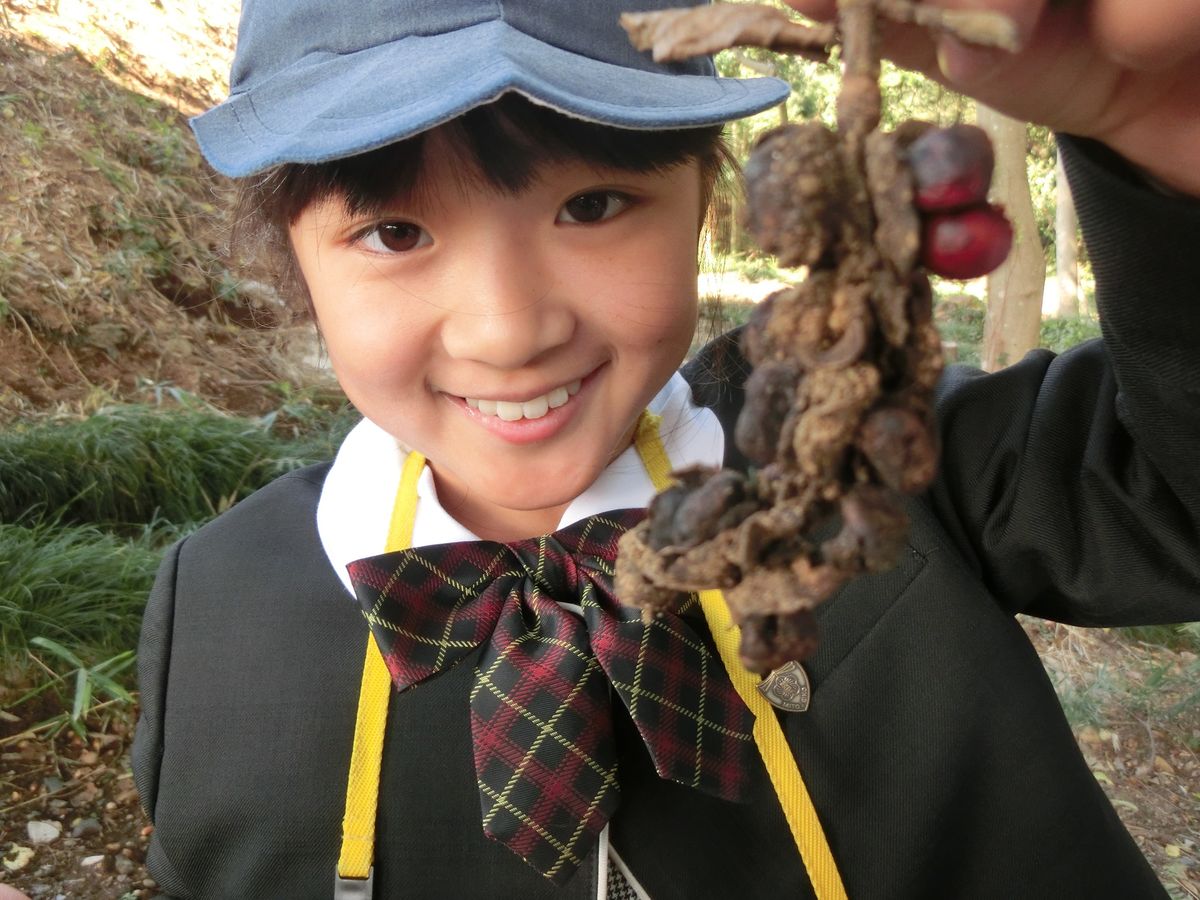 中から赤い実が出てきました。子どもたちは興味津々の様子で実を観察していました。