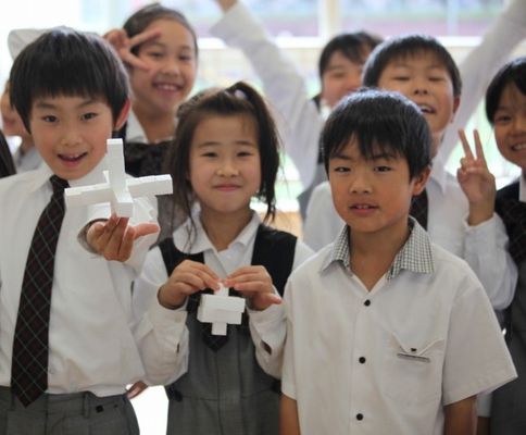 1,2年生のチャレンジ算数では,特注の立方体を組み合わせて,立体に親しんでいます。
