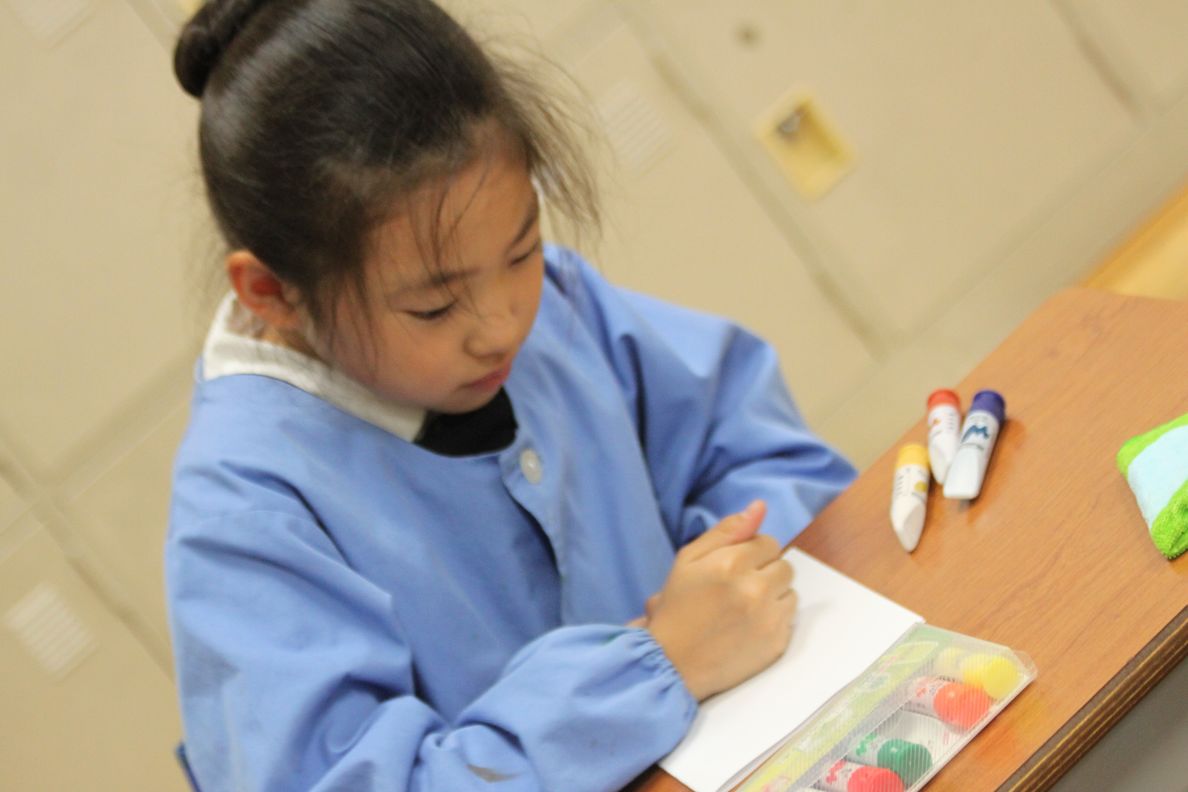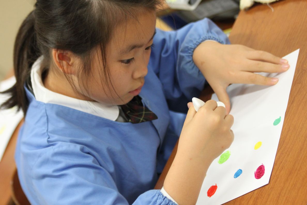 放課後のアート教室の様子です。指に絵の具をつけて,紙に模様をつけていきます。