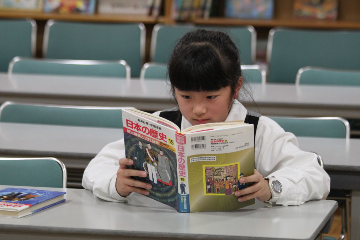 宿題が終わり,図書室では,日本の歴史を読みふける3年生。