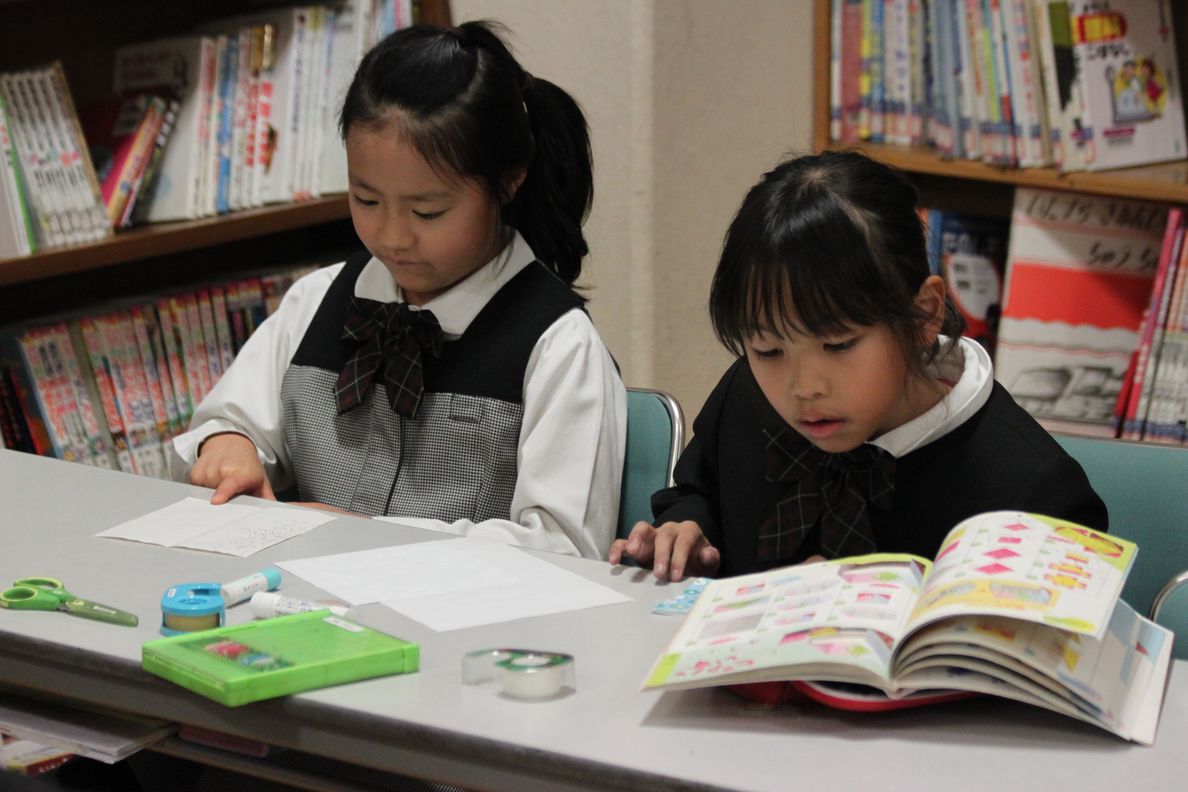 本を読みながら,折り紙の創作作りに取り組む2年生。