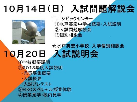2013年度の水戸英宏中学校の入試は新傾向問題となります。国語,算数,社会,理科の入試問題を詳しく解説しますので、ぜひお子様連れでご来場ください。