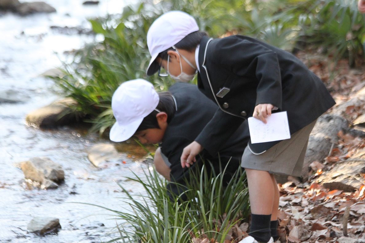 1年生の理科の授業の1コマ。EIKOの泉の湧水の温度を確かめるこどもたち。季節の変化をさまざまなものを通して感じ取る英宏の子どもたちです。