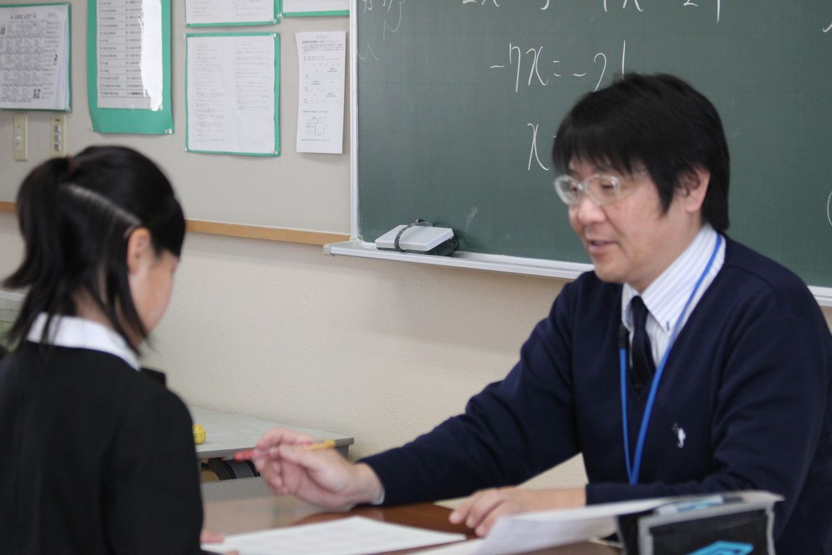 花まる先生の5年生の授業の1コマ。ひとりひとりの解答を丁寧にチェックしています。