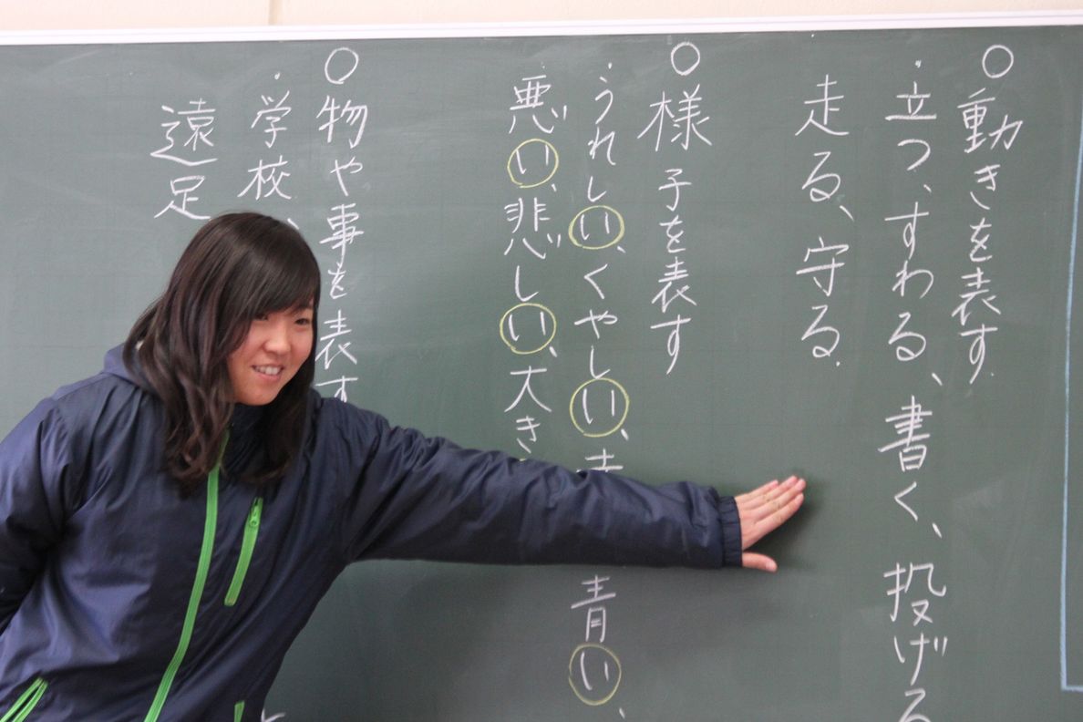 りか先生の2年生の国語の授業の1コマ。口語文法の基礎を学習しています。