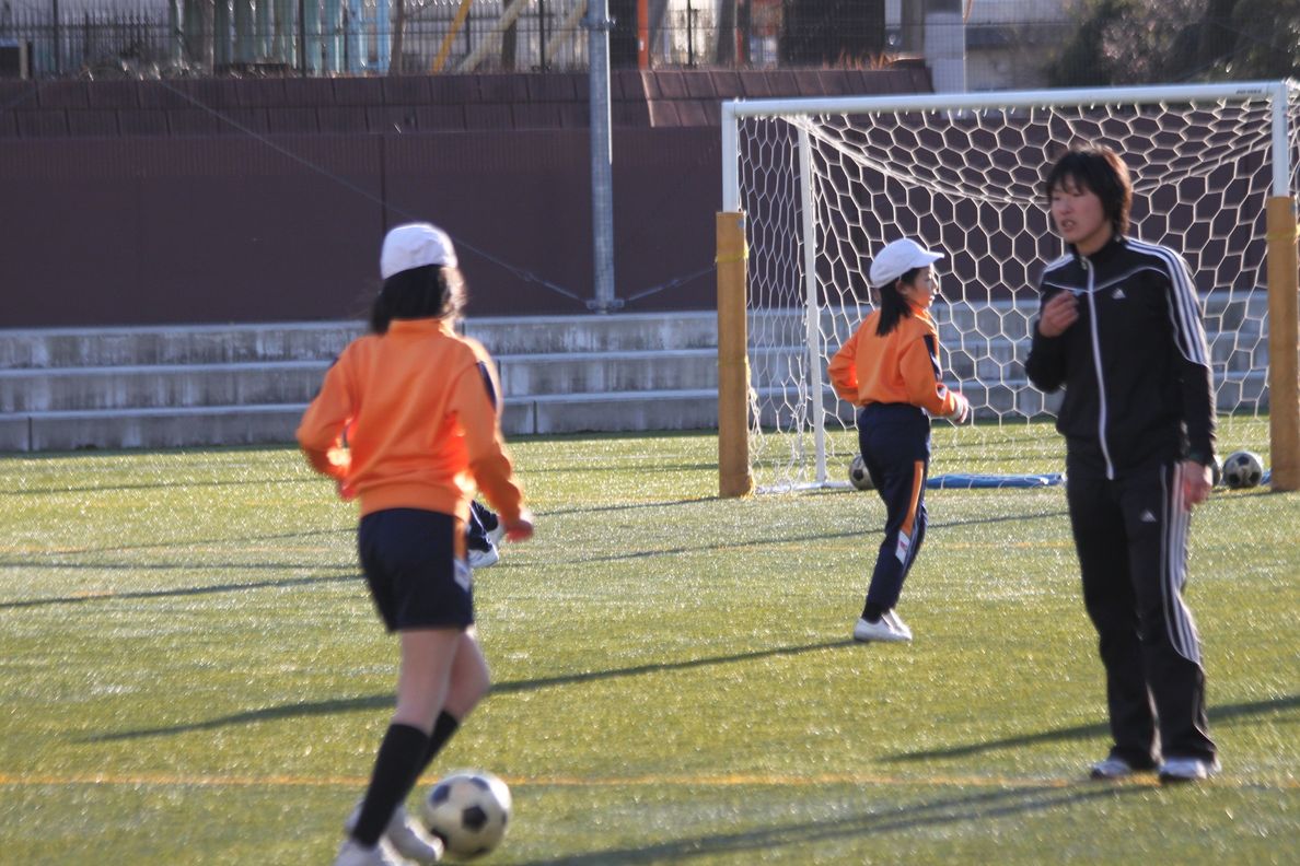 アフタースクールのまい先生の「サッカー教室」の1コマ。春の夕暮れの光の中でボールを追いかける子どもたちの元気な声がグラウンドに響きわたります。