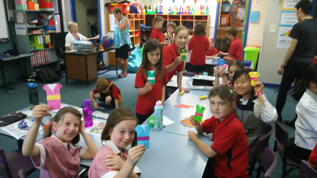 文化交流では英宏小の子どもたちが折り紙細工の作り方をオーストラリアの子どもたちに教えました。