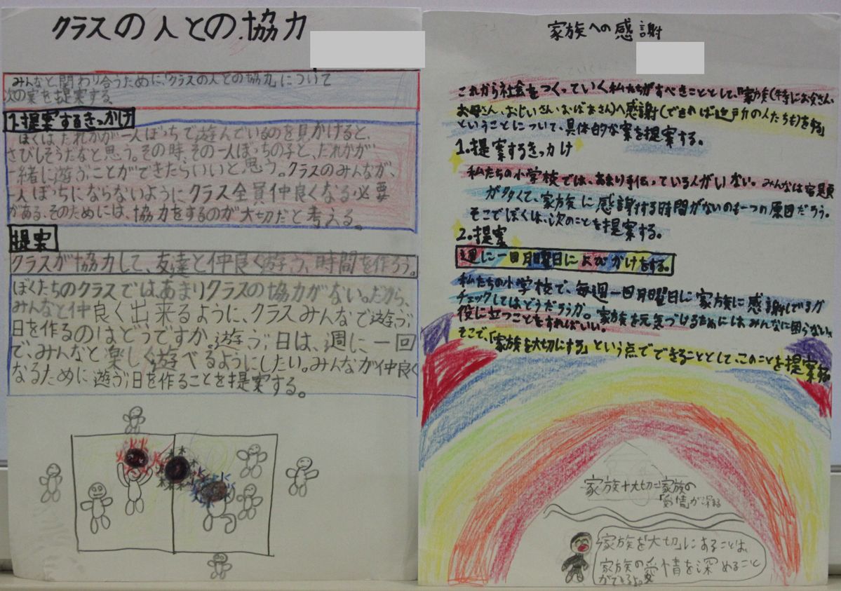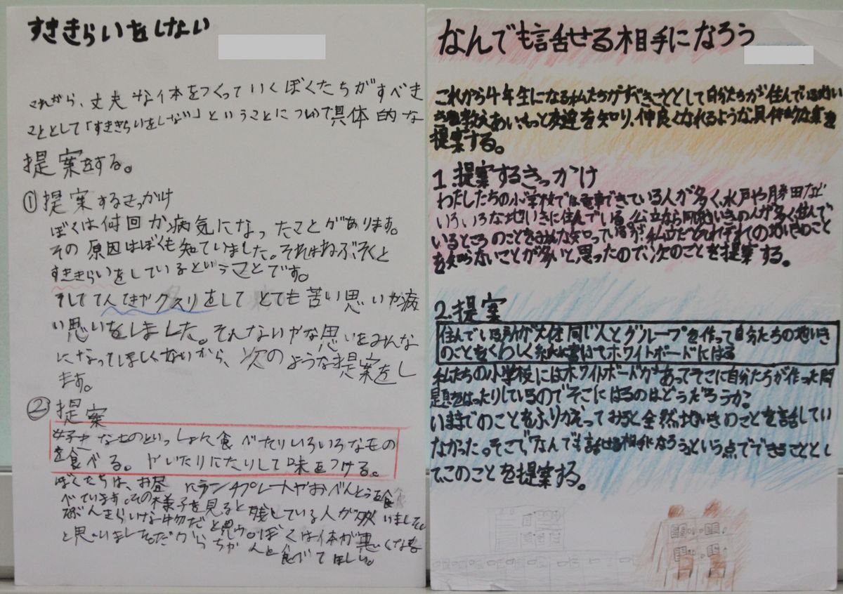 3年生の国語の授業では,よりよいクラスづくりのために提案書づくりを行いました。・教室をきれいにしよう・家族に感謝を伝えよう・誰とでも仲良くなろう・中学生と交流をもとう ・宿題のやり方 など子どもたちは真剣に日常生活を振り返り,様々な提案を考えていました。
