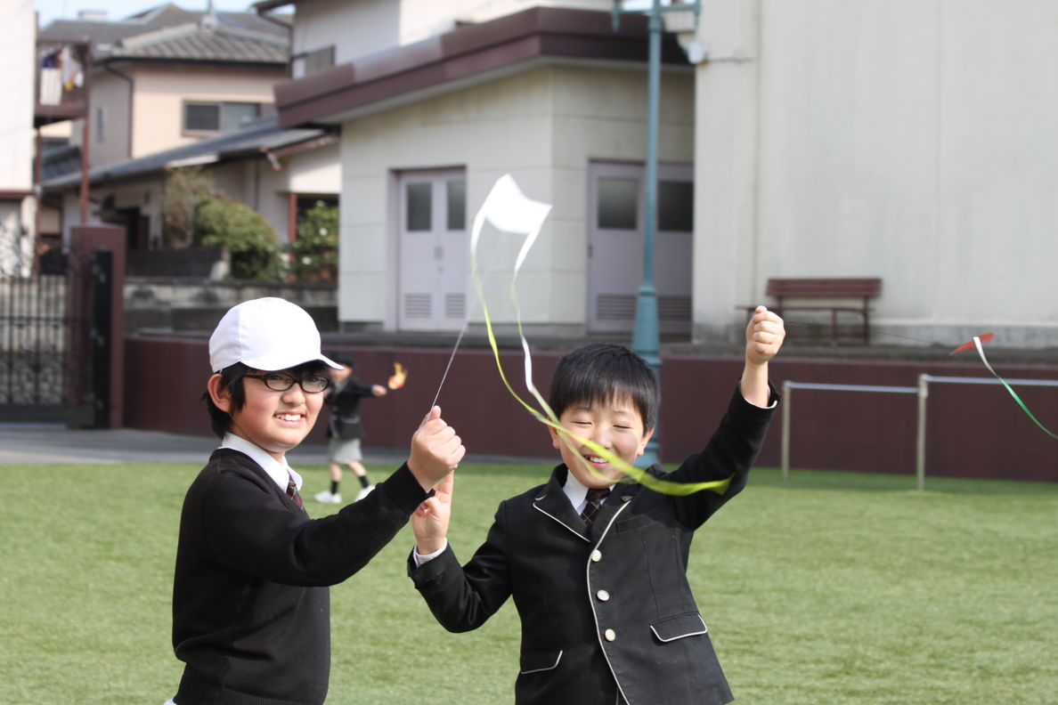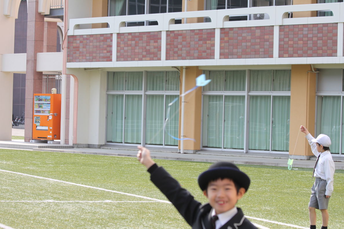 子どもたちの作ったオリガミカイトは,春風に乗り,よくあがっていました。