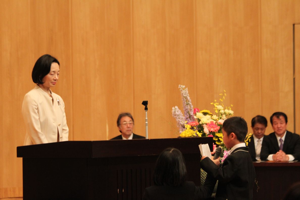 本日は水戸英宏小学校の入学式を挙行しました。校長式辞。校長先生から新入生へあたたかいメッセージが送られます。
