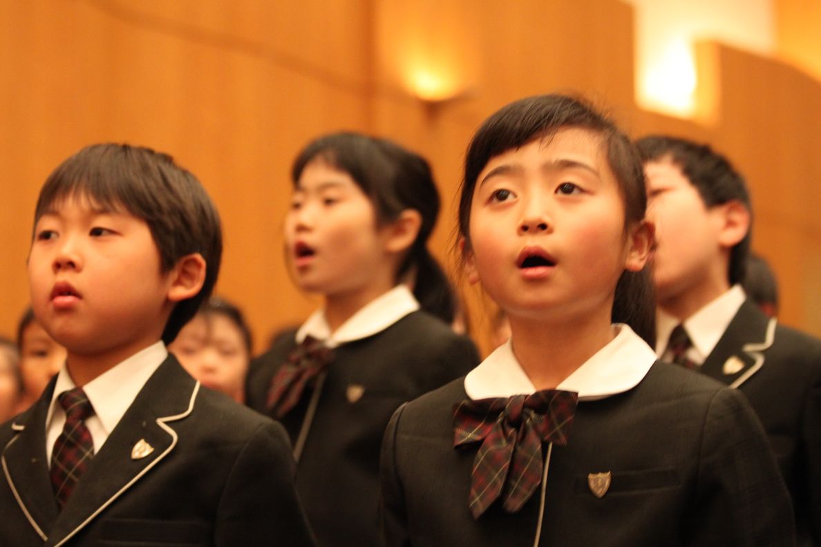 全校児童による校歌。歓迎の気持ちを歌で表現しています。新入生のみなさんご入学おめでとうごさいます。