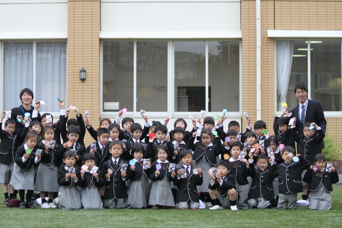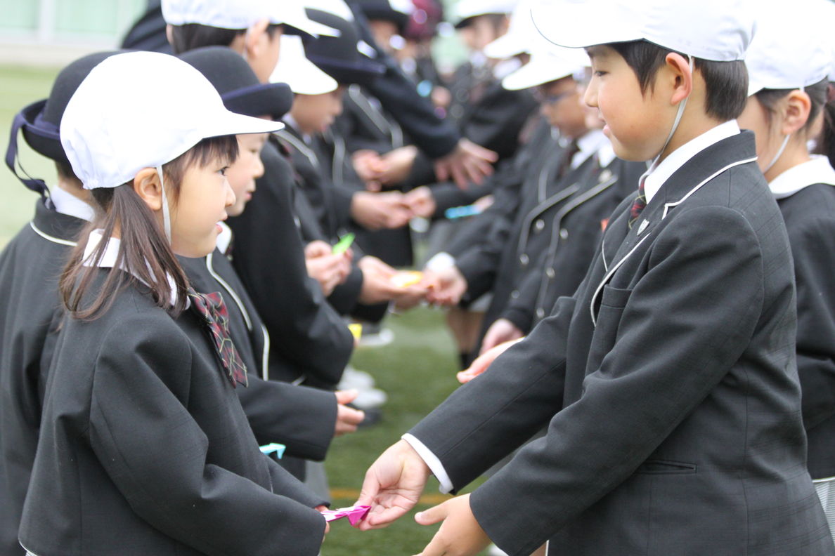 プレゼントをもらう1年生。2年生から折り紙,3年生からひまわりのたね,4・5・6年生からはDo Re Miの歌のプレゼントをもらいました。