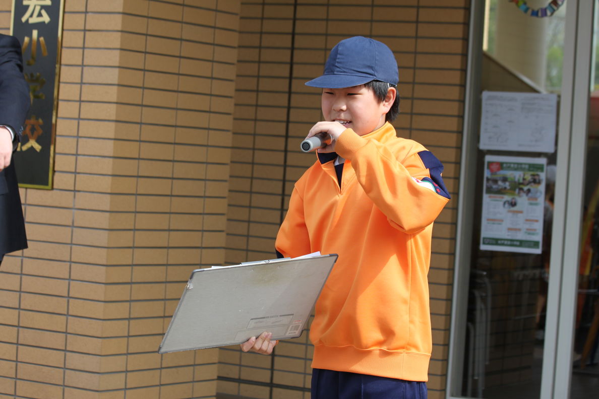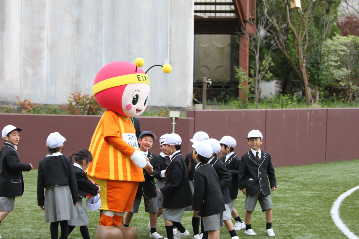 朝,校庭には突然EIKOちゃんの姿が。子どもたちは,初めて見るEIKOちゃんに興味津々です。