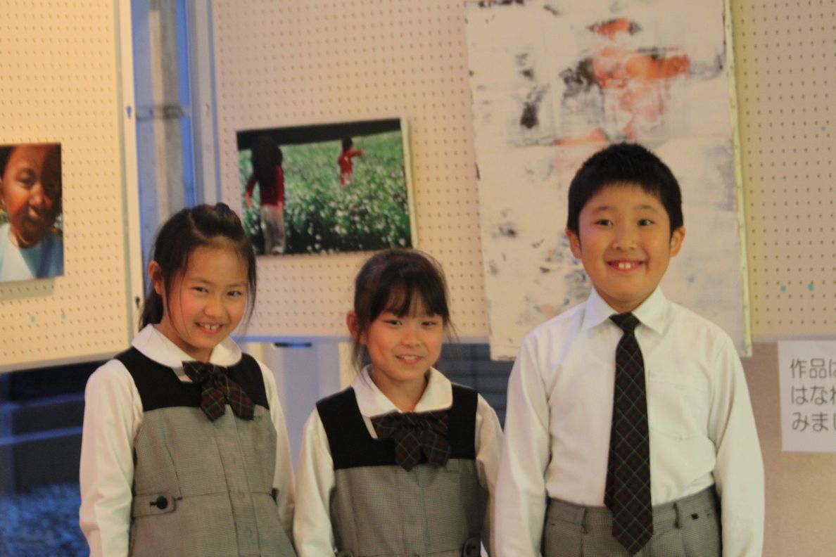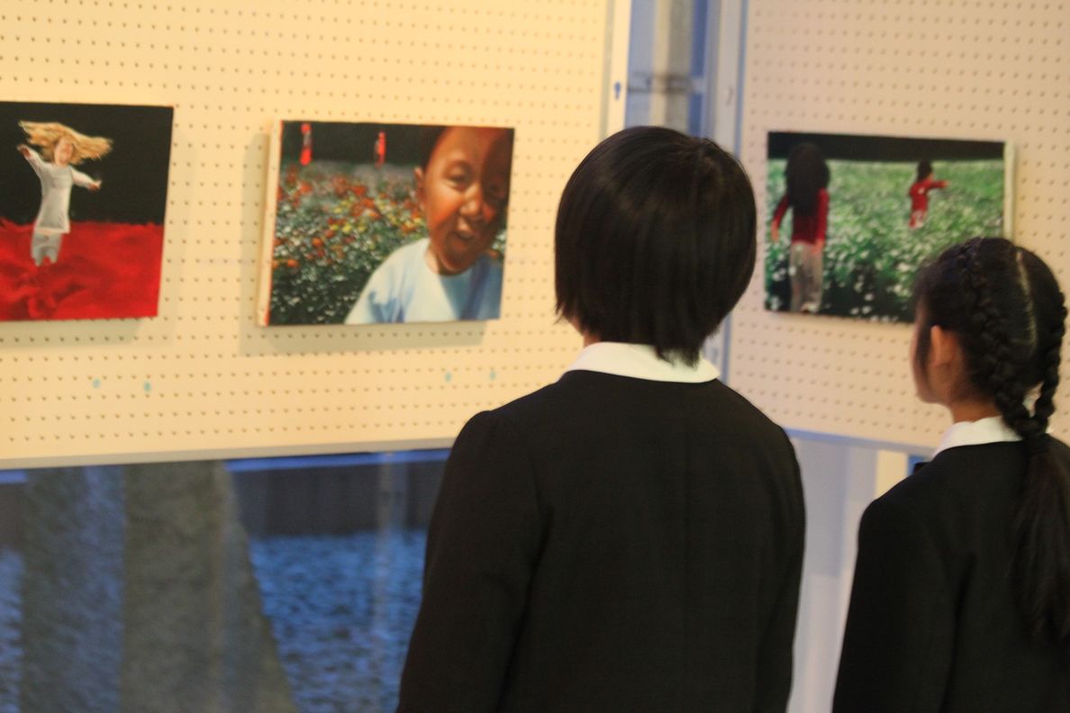 英宏小では開校以来、本物の芸術に触れる場を校内に設けています。今月は現代アートの世界で活躍している菅谷一貴先生の大森弘之先生の作品9点を児童ホールに展示しています。
