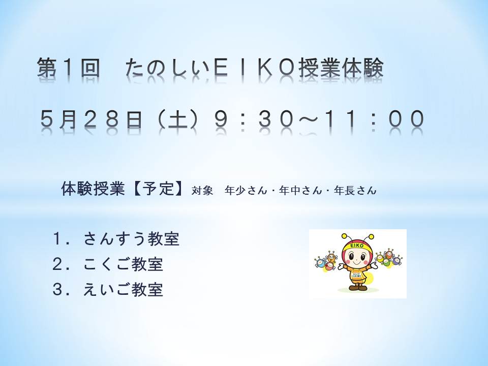 5月28日(土)9時30分~11時に「たのしいEIKO授業体験」を実施します。対象は「年長さん・年中さん・年少さん」です。参加ご希望の方は電話・メール・FAXにてお申し込みください。【要予約】【申し込みは終了しました。たくさんのお申し込みをいただき、ありがとうございました。】
