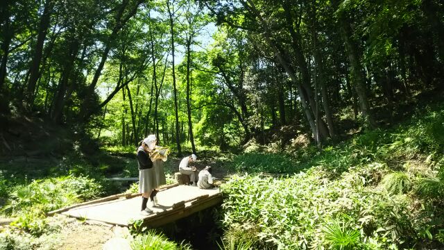 「青々とした草が茂っていて、その周りには小さな虫が飛び交っている。」
