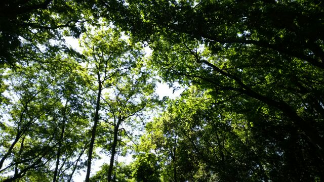 「木と木のすきまから太陽の光がさしこんで、森を明るく照らしている。」