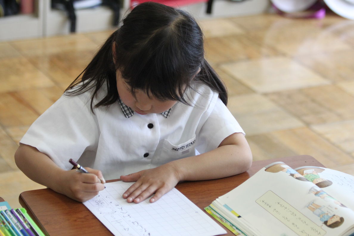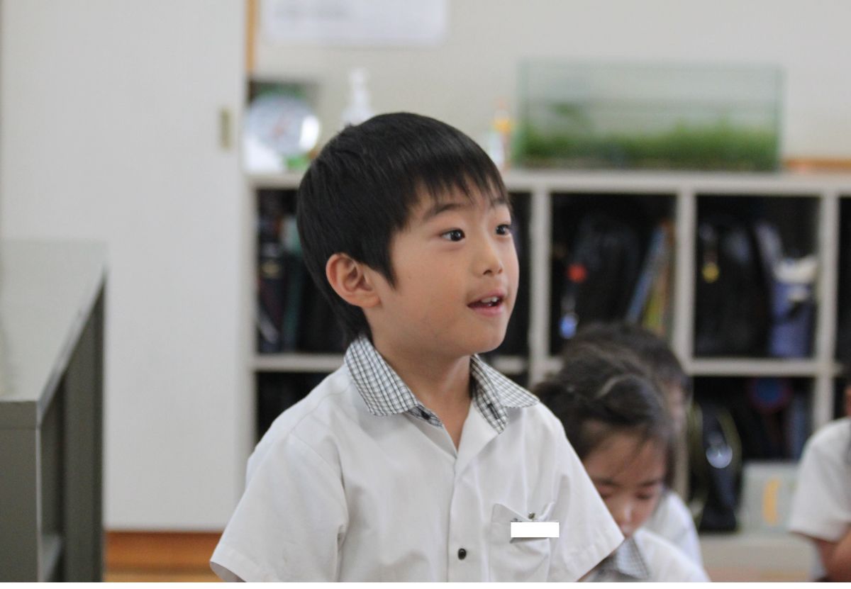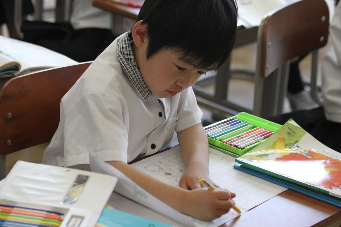 1年生の国語では,宝物を紹介する学習をしています。文章を考えて,丁寧に絵をかいています。