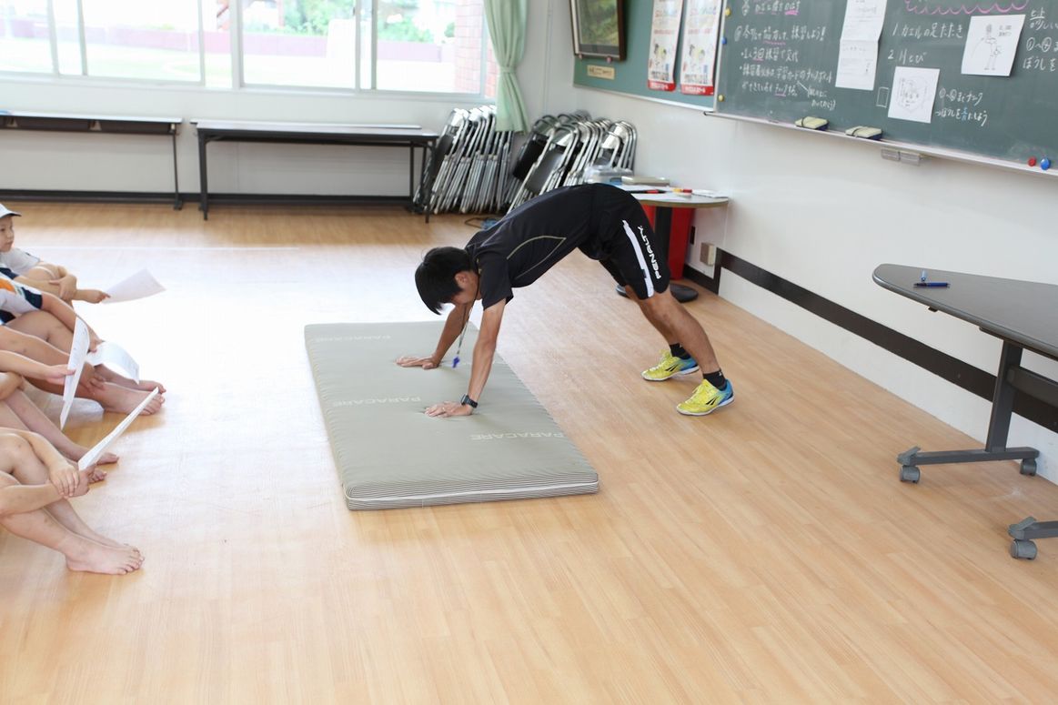 体育の授業です。5年生が倒立前転をするための,基本の動きを習得する研究授業でした。