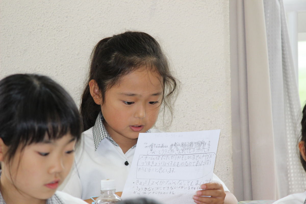 根拠を明らかにしながら、自分の意見を友達に伝えています。周りの子どもたちは、熱心に友達の意見をメモしています。