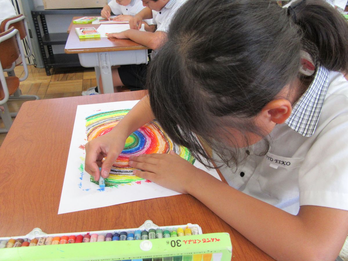 今日のアート教室では,「虹の道」や「太陽の行進」といったそれぞれのテーマをもって,作品づくりに取り組みました。