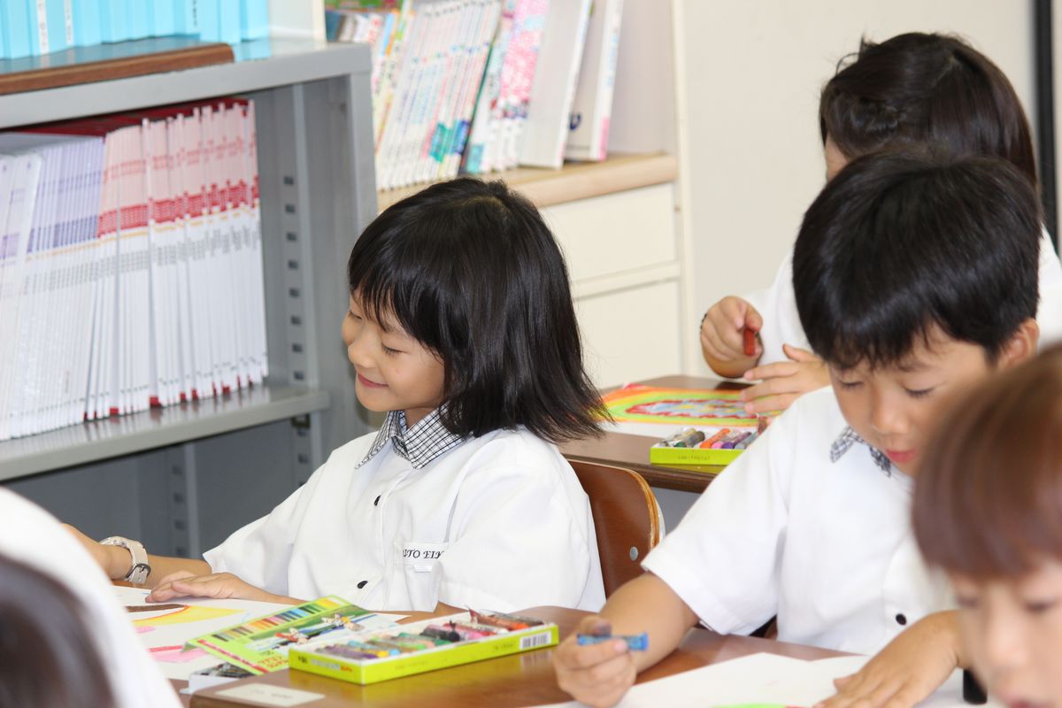 色や形を考えながら,画用紙に色をのせていく子どもたち。