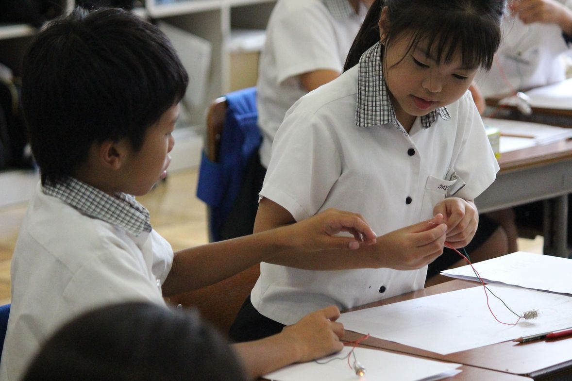 2年生の生活(理科)の1コマ。電池の実験中です。