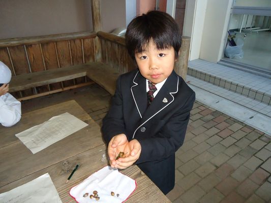 どんぐりの林の中でどんぐり拾いに夢中の子どもたち。どんぐりを二十個以上拾った女の子もいました。