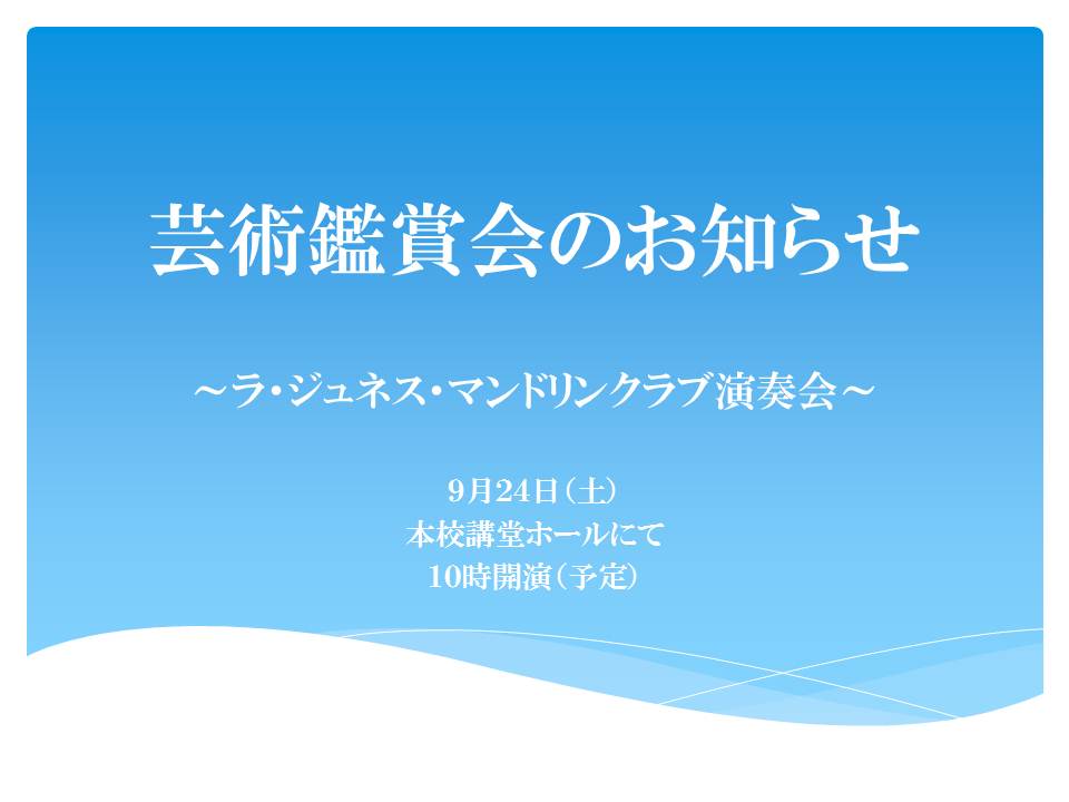 9月24日(土)に本校講堂にて「芸術鑑賞会」を開催いたします。今回は県内を中心に幅広く演奏活動を展開している「ラ・ジュネス・マンドリンクラブ」によるマンドリンコンサートです。演目は「さんぽ」や「夢をかなえてドラえもん」など子どもたちに親しみやすい曲からクラッシックまで幅広い曲目を予定しています。本校関係者の方でたら、どなたでも観覧できますので、お気軽にご来場ください。