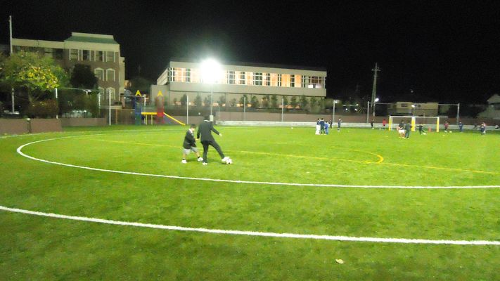グラウンドで担当教員とサッカーをする子どもたち。