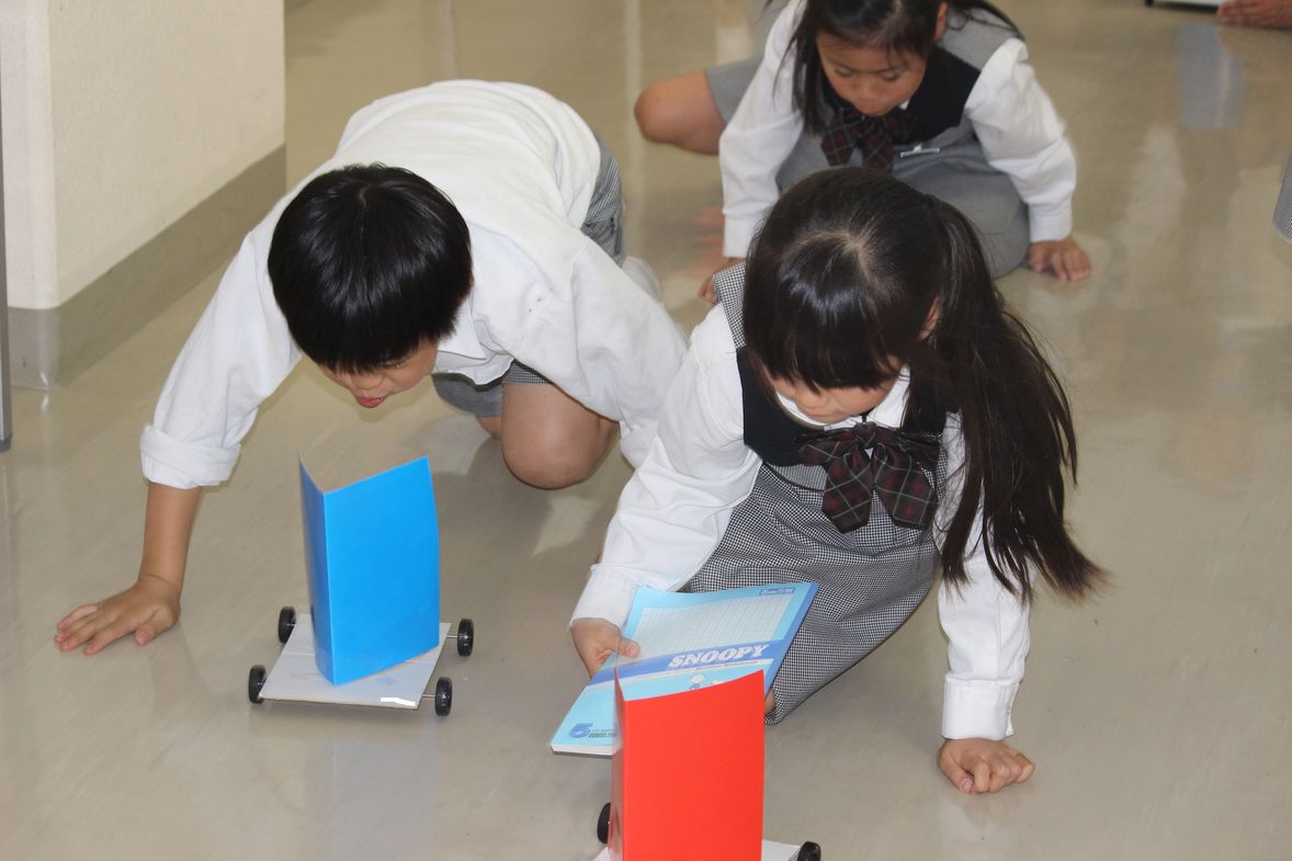 今日の2年生の生活科は「風」で動く車の実験・観察です。