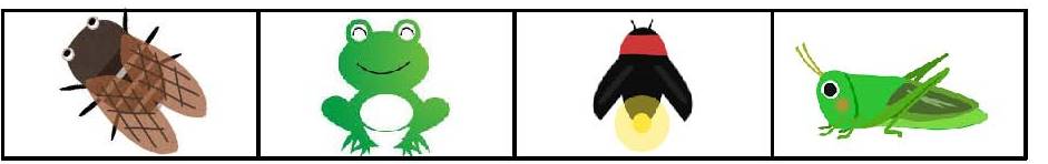 【4】カエルはセミより重いです。ホタルはセミよりも軽いです。バッタはセミよりも軽いです。一番重い生き物はどれでしょう。