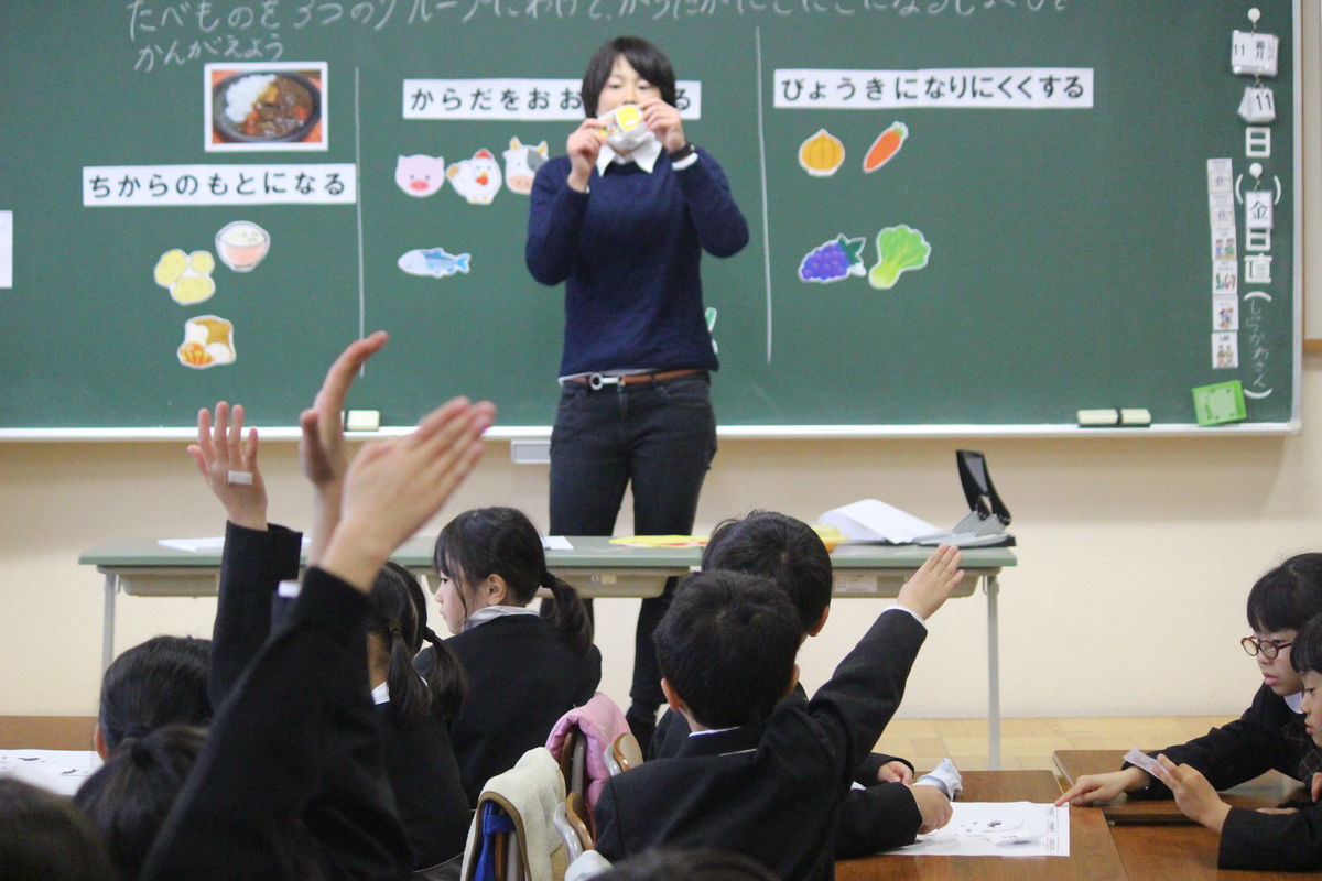 5時間目は1年1組で学活の研究授業がありました。課題は「食べ物のグループ分けをしよう。」です。食べ物の栄養素は3つのグループに分けられるという内容です。