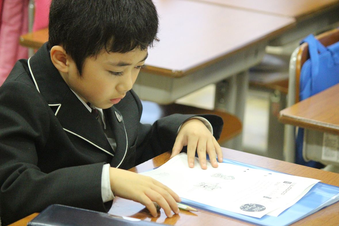1年生の「ロジコ教室」の1コマ。低学年向けの読解力・思考力を鍛える教材に取り組んでいます。