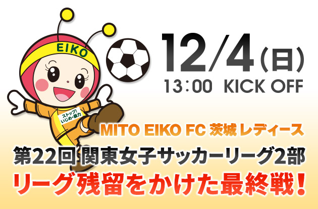 第22回 関東女子サッカーリーグ2部リーグ残留を懸けた最終戦となりました。皆さま、更に熱い応援をよろしくお願いいたします!対 前橋育英高校[ホーム]12月4日(日) 13時キックオフ笠松運動公園サブグラウンドひたちなか市 大字佐和2197-28MITO EIKO FC 茨城レディース一同
