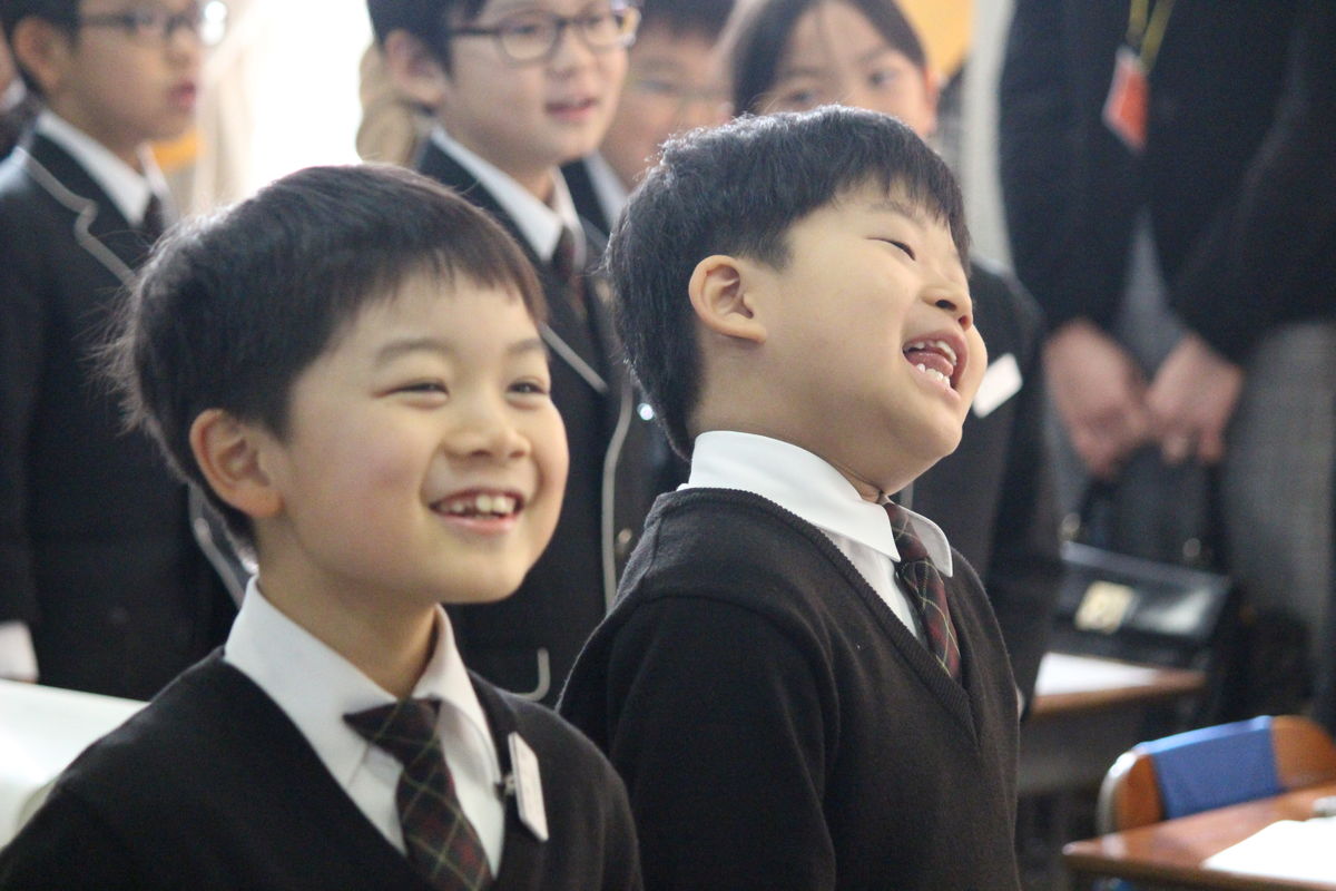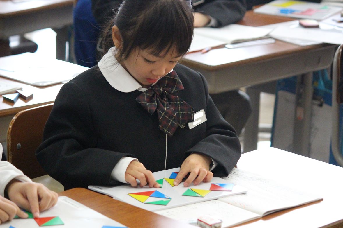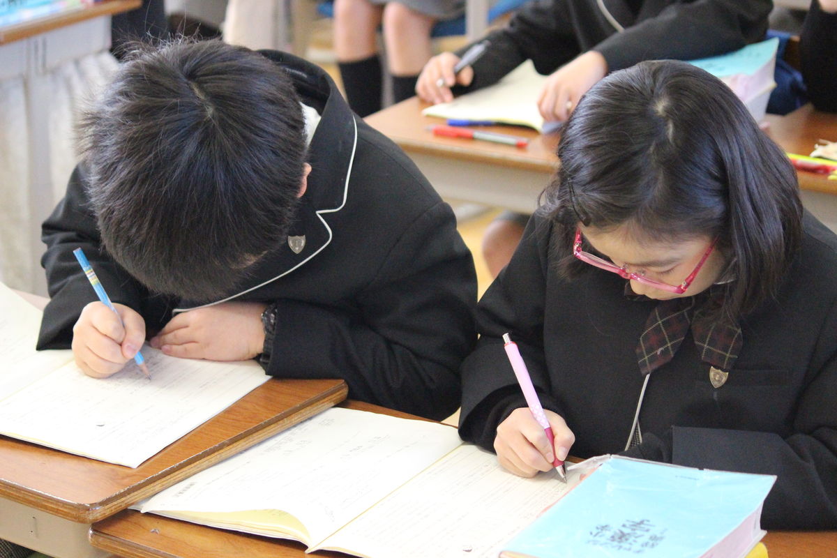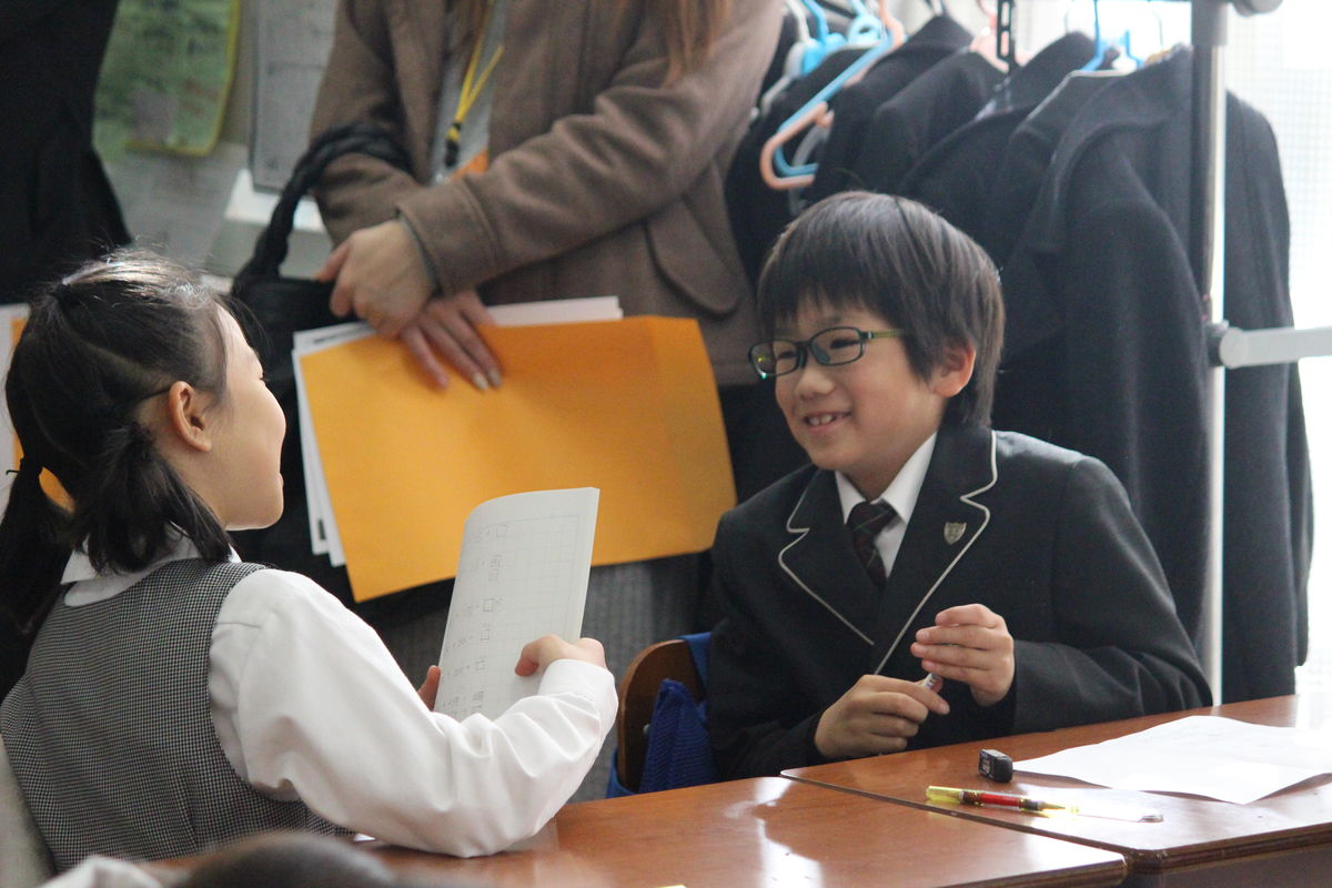3年生も算数の授業です。ペア学習の形式をとり、自分たちで作った計算問題を出し合いました。
