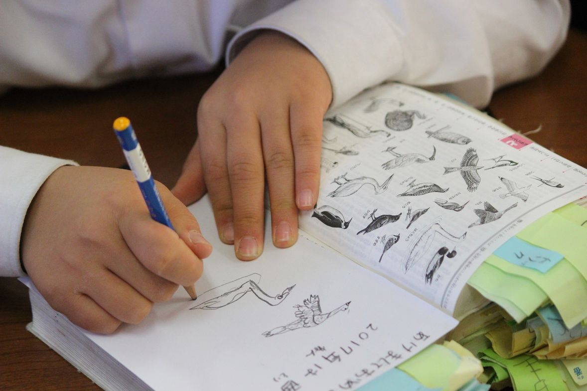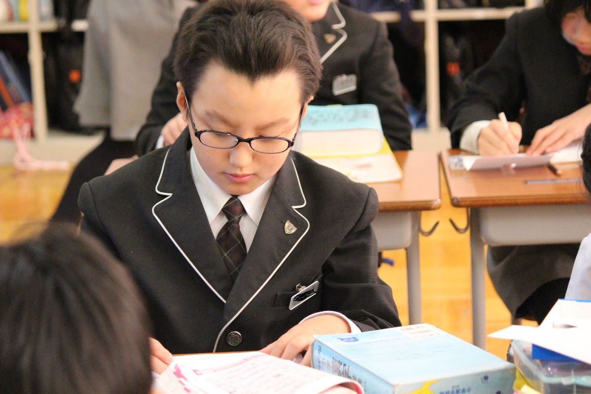 本校ではアメリカやオーストラリアの交流姉妹校が8校あります。今、子どもたちは現地校とのカード交換用のカードを作成しています。