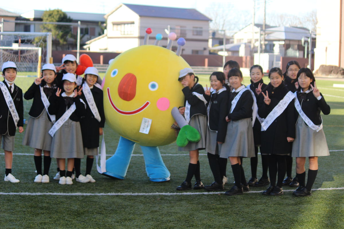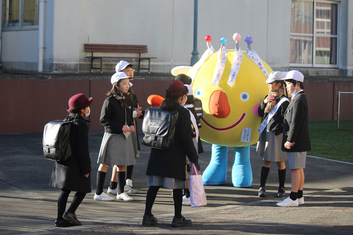 本日,「いきいき茨城ゆめ国体2019」のマスコット“いばラッキー”が来校し,あいさつ運動実行委員会の児童と一緒に,あいさつ運動をしました。