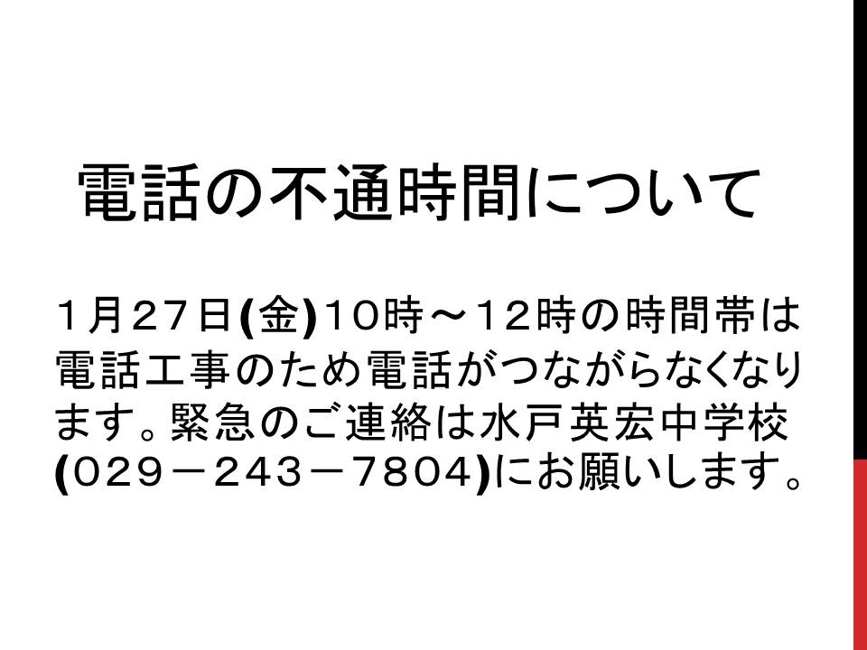 電話工事が延長しているため午後5時半現在も電話は不通となっています。急用のある方は水戸英宏中学校までご連絡ください。