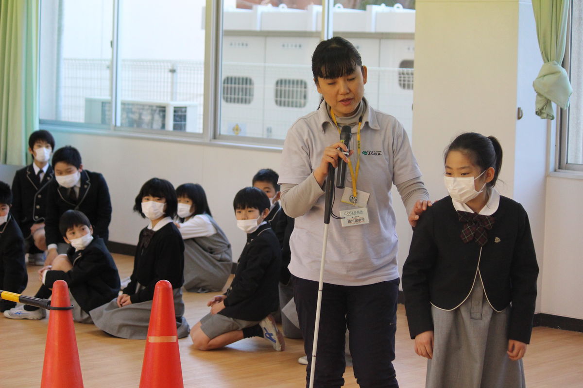 本日は4・5年生の児童を対象に「盲導犬キャラバン」(協力 公益財団法人 日本盲導犬協会)が実施されました。同キャラバンは「子どもたちに視覚障がい者に積極的に声をかけられるようになること」を大きな目的としています。本日は同協会のスタッフ3名と盲導犬1頭、盲導犬PR犬1頭が来校し、視覚障がい者の現状及び盲導犬の活動についてお話をしていただきました。