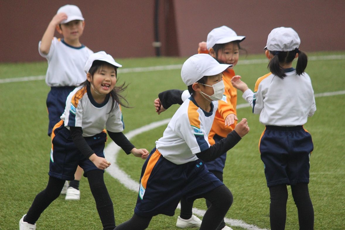 笑顔で体育に取り組む1年生。寒さに負けずに頑張っています。