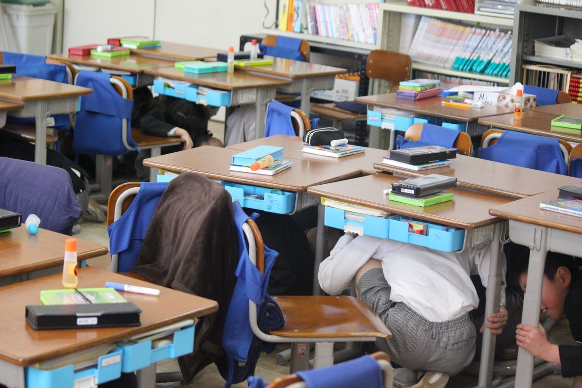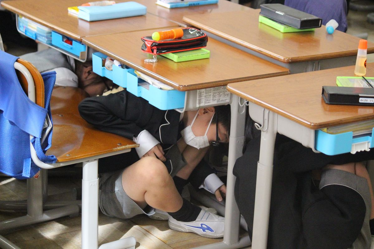 シェイクアウトは,地震の際の安全確保行動を身に付ける機会です。子どもたちは,「まず低く,頭を守り,動かない」を意識して行動していました。