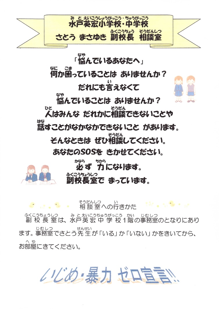 水戸英宏小中学校の児童・生徒を対象に佐藤雅之副校長による二者面談が今週月曜日より始まりました。小学校では新1年生~新6年生を対象に今月下旬から夏頃までかけて実施される予定です。