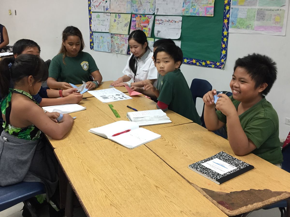 セレモニー後は、各クラスに分かれ,キャンパスツアーにいきました。学校の敷地の大きさに驚いていました。クラスに戻ったら、折り紙を英語で説明しながら、一緒に折りました。UPIの児童は、出来たかぶと,鶴や手裏剣をとても喜んでいました。