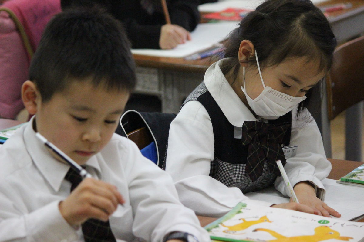 1年生の国語の授業の1コマ。まもなくお兄さん・お姉さんになる1年生。4月の新入生の入学を楽しみにしています。