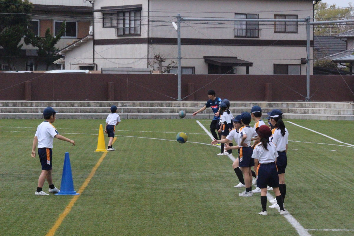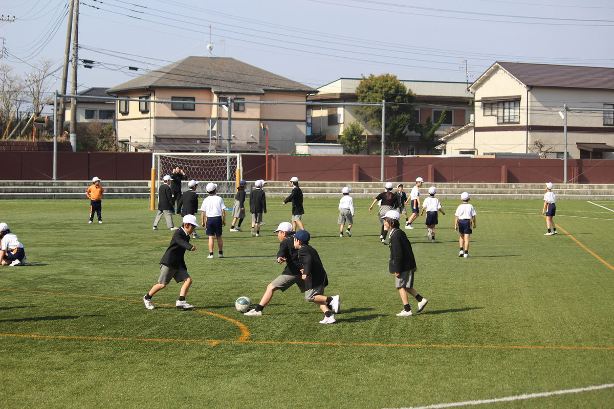 登校後、校庭ではみんなでサッカーのミニゲーム